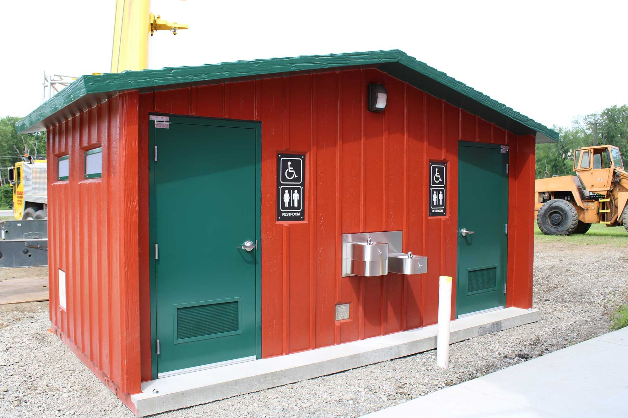 The Cortez flush restroom building is 10’ 3” x 17' that features two separate, single-user fully-accessible flush restrooms that each include a vitreous china sink and water closet, mirror, coat hook, ADA grab bars, a toilet paper dispenser, and interior and exterior LED lights. The restroom that was donated to the museum also includes an ADA dual height drinking fountain.
